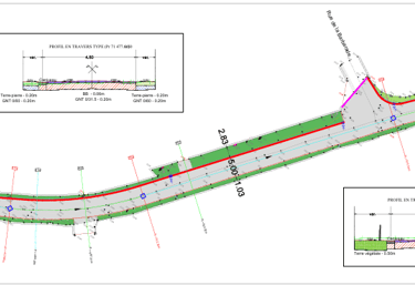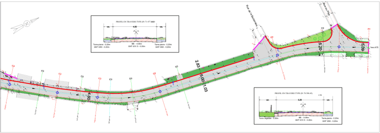 Nous établissons les pièces graphiques nécessaires à l'établissement d'un DCE (dossier de consultation des entreprises) dans le cadre d'un appel d'offre mais aussi en phase d'exécution des travaux . Nous livrons des plans de terrassement, plan de revêtement et de nivellement, plan de réseaux secs et humides, profils en long et en travers, coupes , épure de giration etc. Nos plans sont effectués avec les logiciels autocad et covadis.